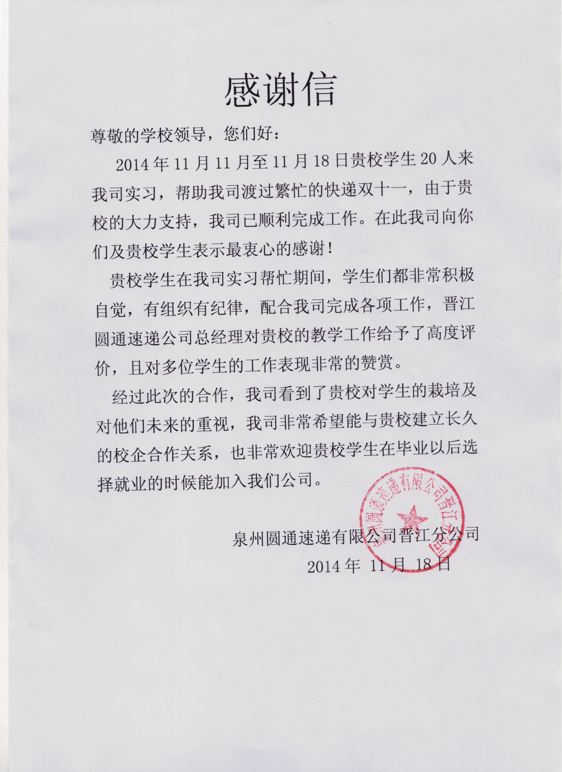 我校商学院学子前往晋江圆通快递有限公司实践 我校商学院学子在“双十一”中表现获得圆通公司的领导赞许 泉州圆通速递有限公司晋江分公司向我校发来感谢信 为提升学生的动手实践能力,实现...