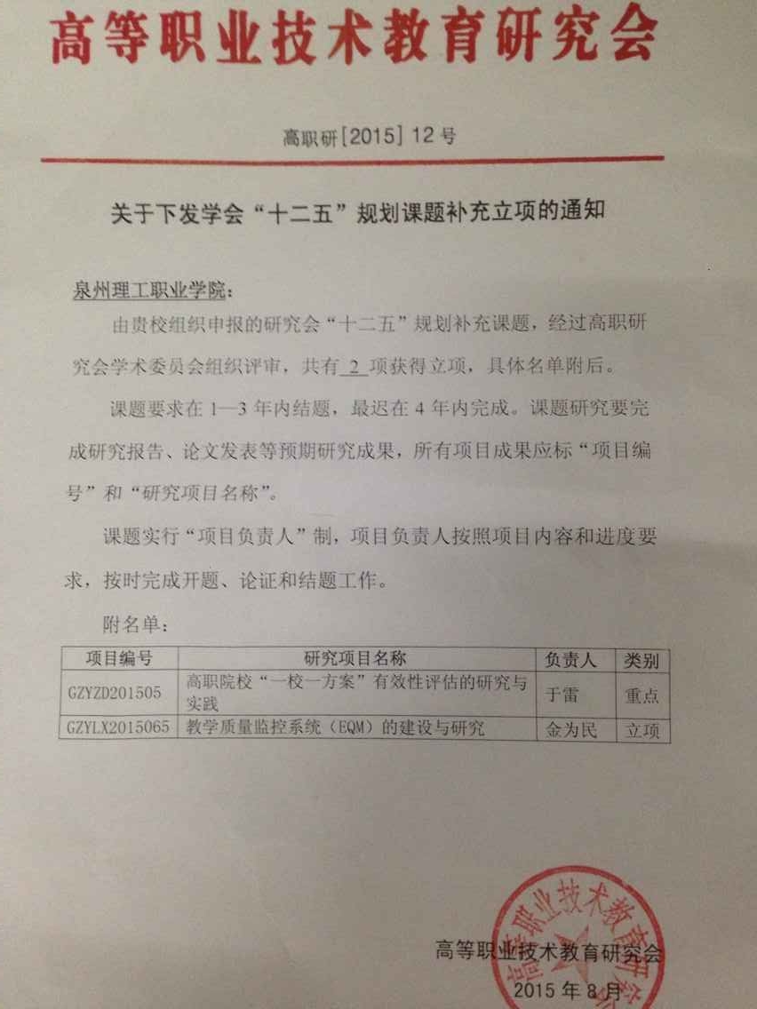 近日,高等职业技术教育研究会下发《关于下发学会“十二五”规划课题补充立项的通知》,由我校副校长于雷教授负责的《高职院校“一校一方案”有效性评估的研究与实践》项目获得重点立项,我校教务处处长金为民教授负...