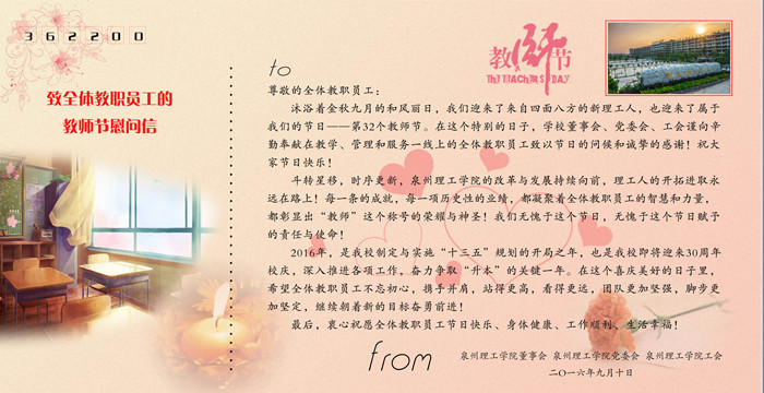 致全体教职员工的 教师节慰问信 尊敬的全体教职员工: 沐浴着金秋九月的和风丽日,我们迎来了来自四面八方的新理工人,也迎来了属于我们的节日——第 32 个教师节。在这个特...