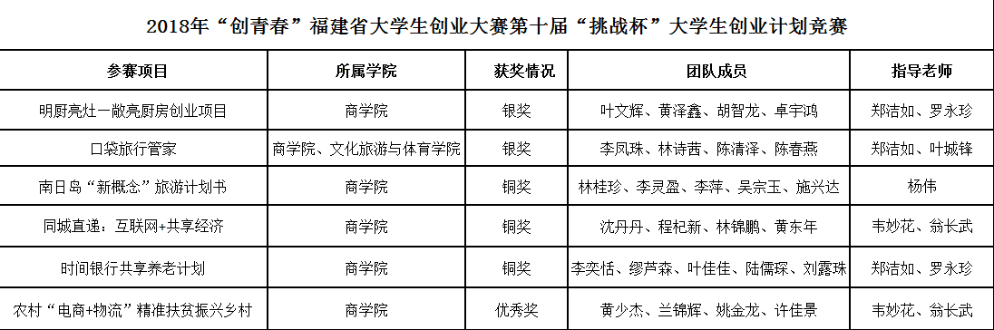 由共青团福建省委、福建省教育厅等部门联合举办的2018年“创青春”福建省大学生创业大赛第十届“挑战杯”大学生创业计划竞赛中,我校共有6个参赛项目获奖,其中《明厨亮灶--敞亮厨房创业项目》、《口袋旅行管家项目》...