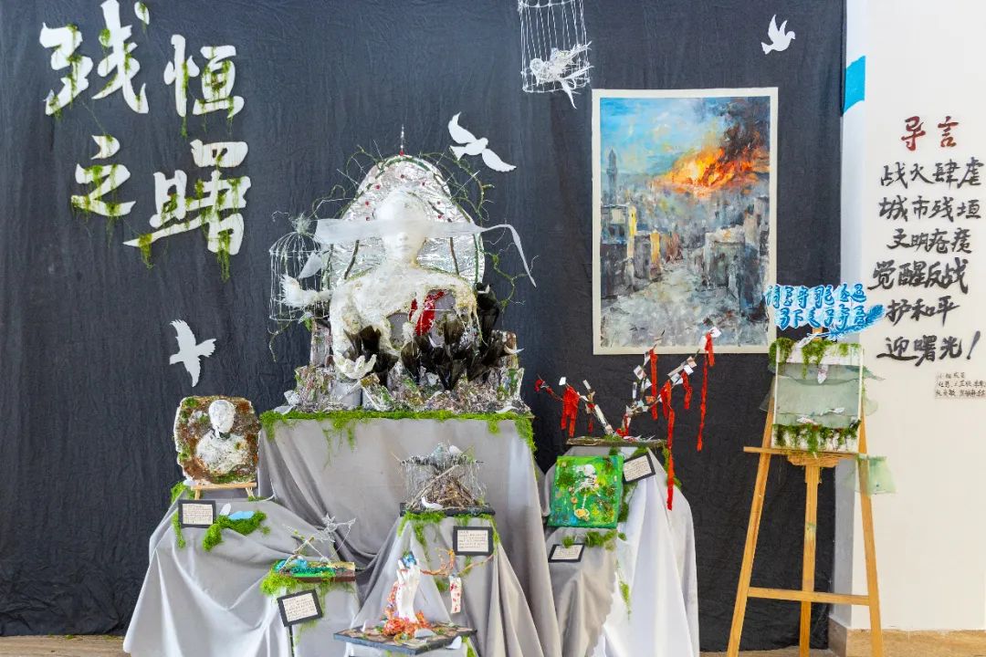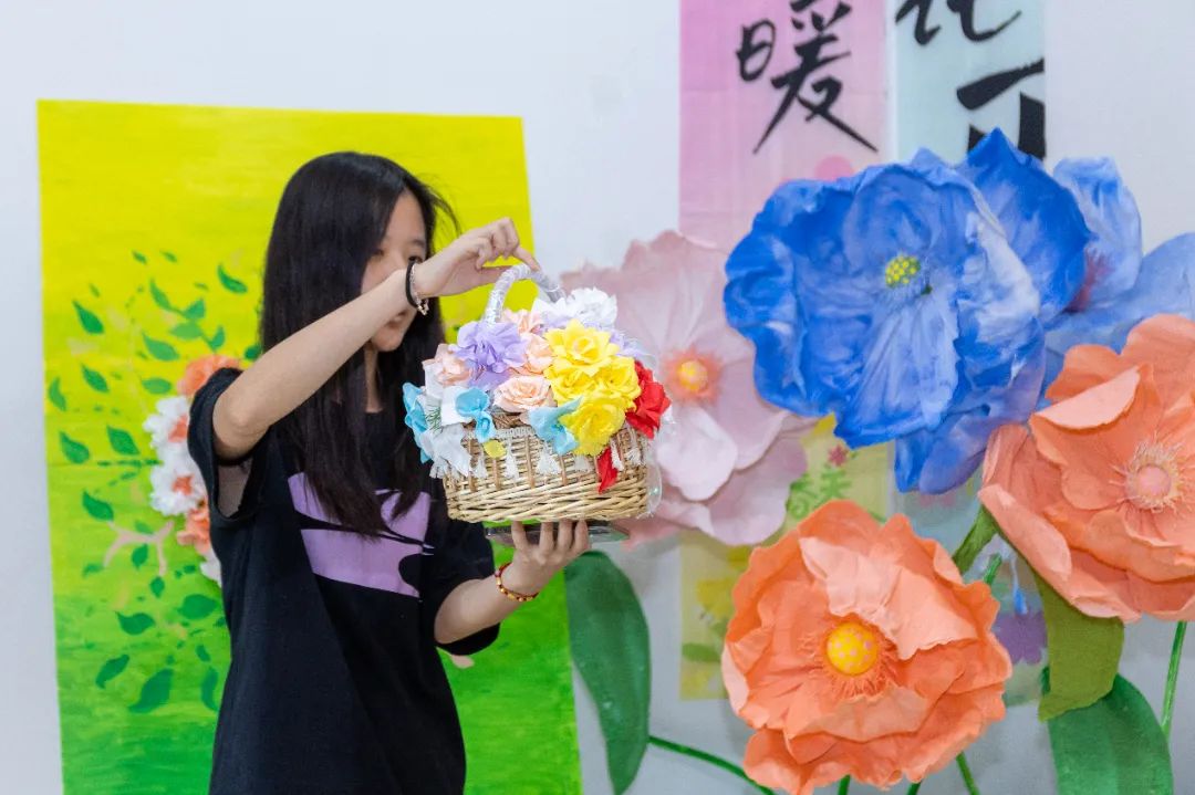 比赛期间,教育学院4楼实训室的备赛间,处处是选手们忙碌的身影,为达到理想中的效果,同学们不断打磨、试验。团队成员各司其职,用团结协作和精益求精的精神,将创意凝聚成独一无二的环创作品。《巨人的花园》团队从绘本故事解构出发,历经数十次设计修改;《万物新生》团队为了呈现“破茧成蝶”的视觉张力,反复试验了3种材质的蝴蝶翅膀透光效果;《春之颂歌-自然的礼赞》团队为了还原田野肌理,手工雕刻200余片纸质麦穗。