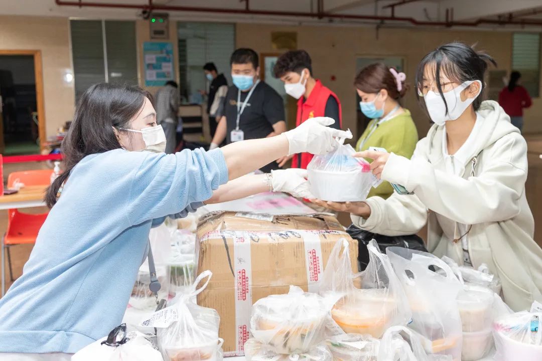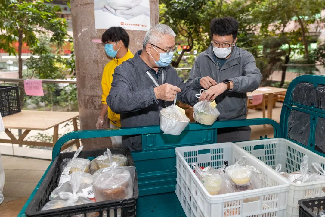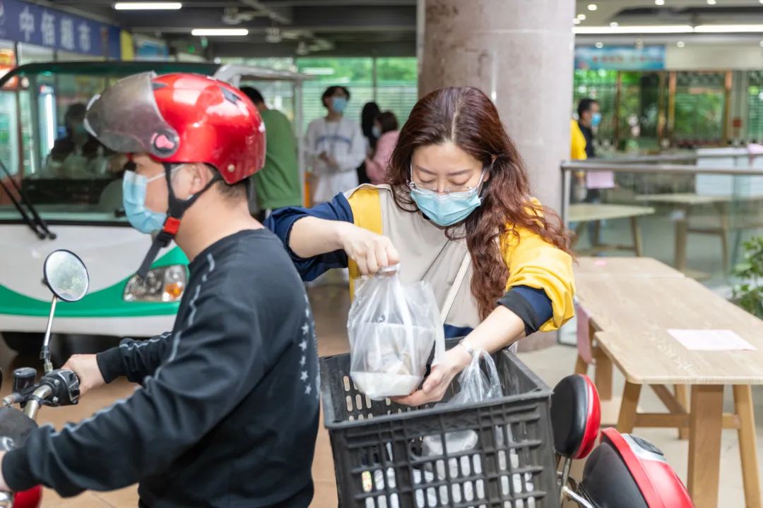 接收、分类、装箱,再一件件抬上电瓶车运到各个书院分发……3月21日,校领导、教职工、教工家属纷纷加入抗疫教职工志愿服务队中,共出动近百人次,为全校学生提供送餐服务,全力保障学生们的用餐。