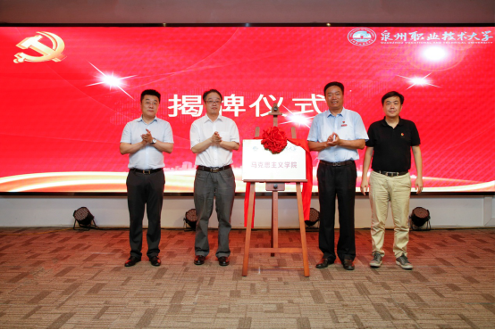 庄文瑞副校长宣读《关于成立泉州职业技术大学马克思主义学院的通知》文件, 经学校党委研究,决定在思政教研部基础上成立马克思主义学院,聘请钟君为马克思主义学院名誉院长,特聘刘小新为马克思主义学院专家组组长,特聘王福民为马克思主义学院专家,聘任林其天为马克思主义学院院长、林文艺和陈静为马克思主义学院副院长。