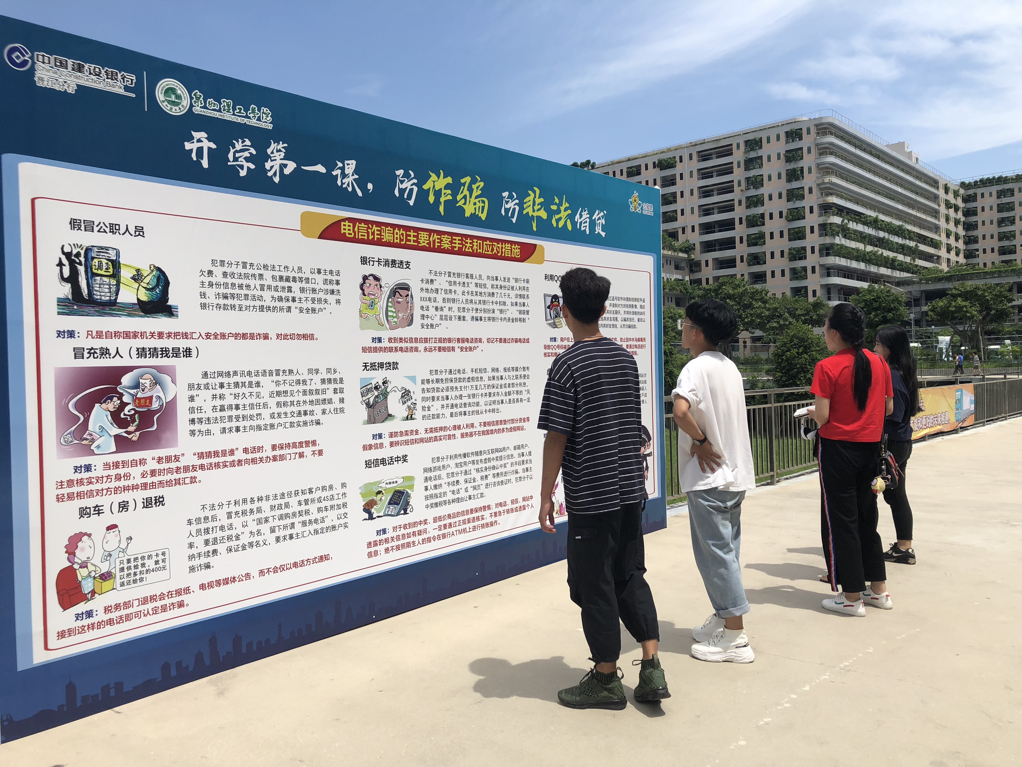 9月11日,泉州理工学院联合福建省农信农商行助学贷款项目组及中国建设银行内坑支行一同以金融知识进校园——“正确使用金融服务,依法维护自身权益”开展专题活动作为新生入学第一课。以讲座、解疑答难、散发折页等形式,向大学生进行防范金融诈骗和电信诈骗、校园贷等内容的普及与教育工作,提醒广大同学提高金融风险辨别能力。