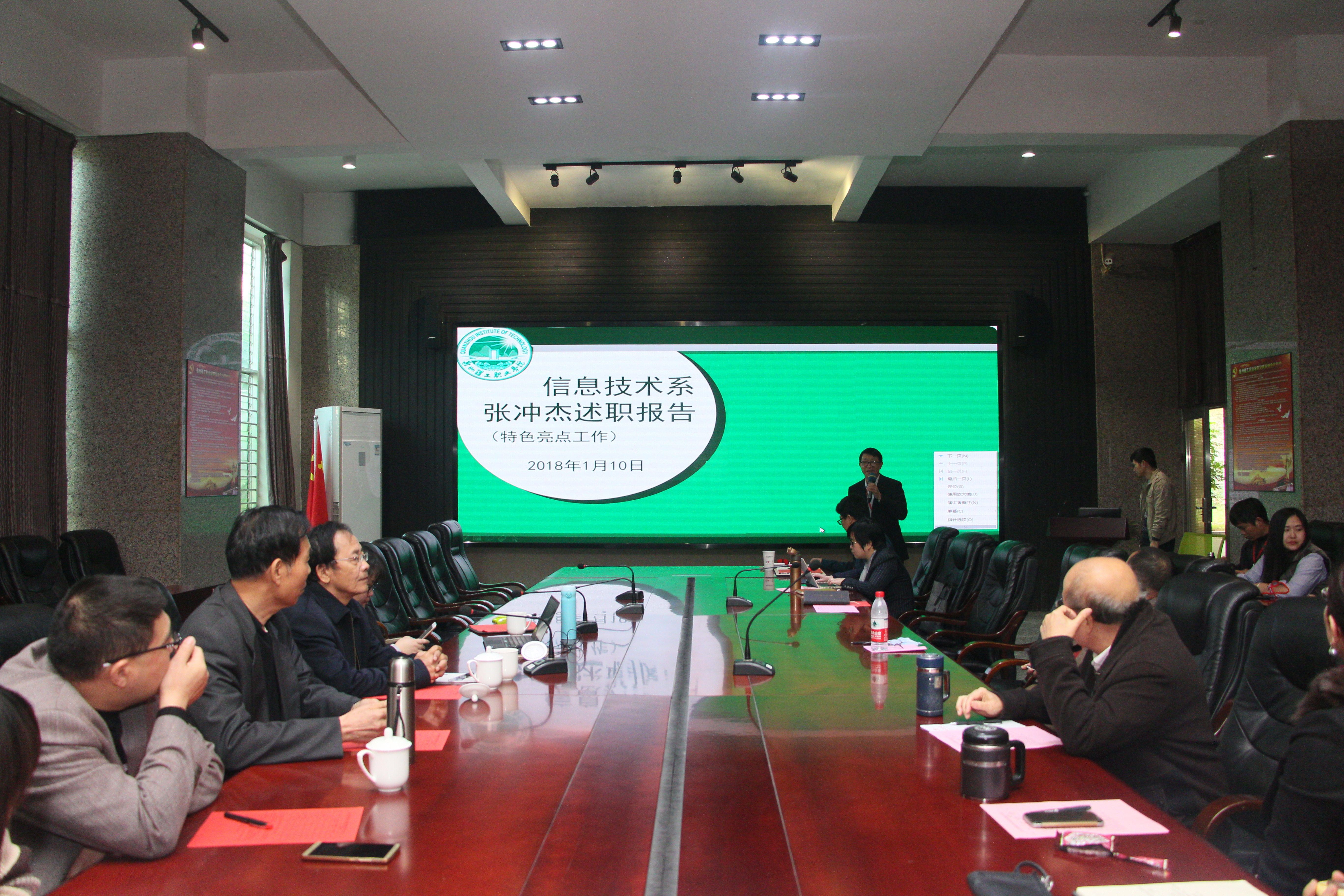 1月23日,六个教学单位进行述职。工学院2017年工作计划共16大项71小项,其中已完成的有51项,进行中的有15项。在科研创新方面,举办多场学术讲座有,20项科研成果在福建省6.18项目推介会亮相,编制3项实验工艺流程,研发智能控制百叶窗,并成功研发沼气提纯装置使用于改装的观光车。在成果及亮点方面,2017年获批市级及以上科研创新立项10项,横向课题及自研课题8项,省级及以上质量工程建设项目6项,发明专利9项,获得省级以上10项、校级17项奖项。