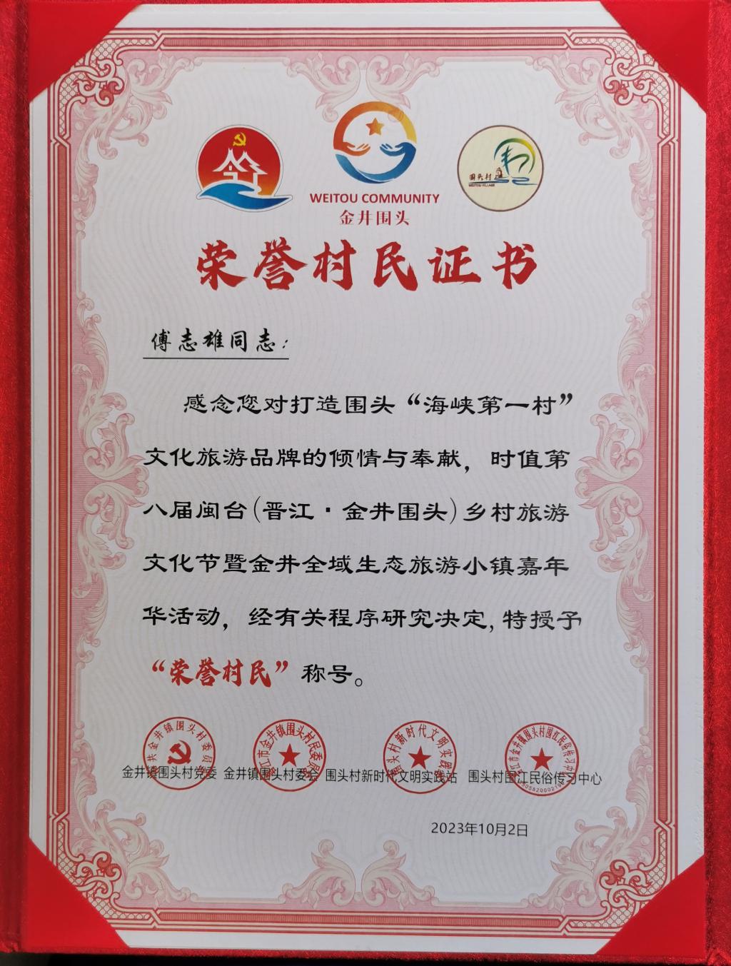 活动中,傅志雄等7人获评2023年度荣誉村民,围头村委会党委书记洪水平为荣誉村民颁发证书,并赠送村标模型。