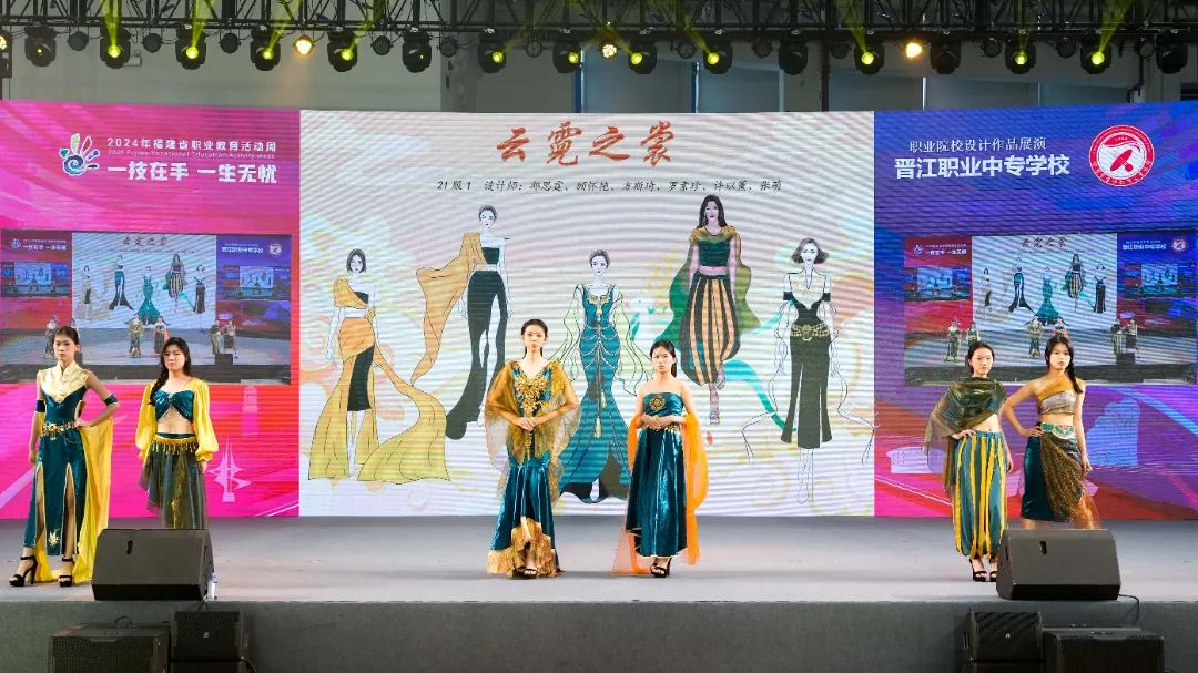 晋江职业院校服装设计作品展是一场视觉与艺术的盛宴,由“追忆与传承”“循梦而行”“云霓之裳”等多个主题交织而成,呈现出一台别出心裁的服装表演“大戏”。