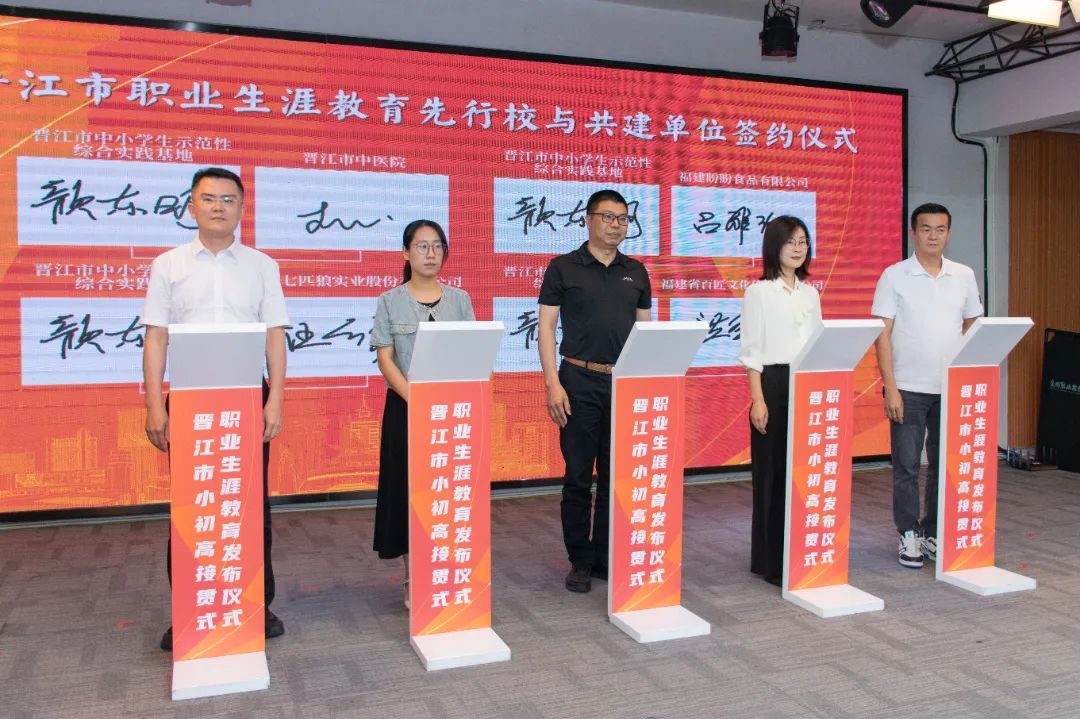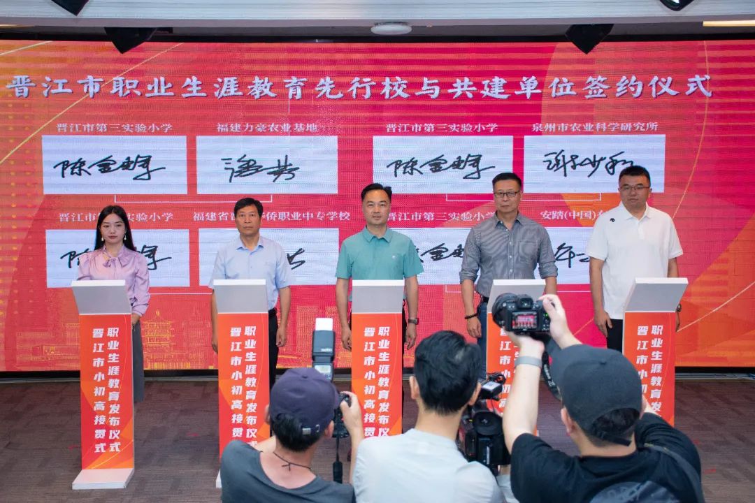 会上举行晋江市职业生涯教育先行校与共建单位的签约仪式。晋江市第二实验小学、晋江市首峰中学、泉州五中桥南校区、福建省晋江华侨职业中专学校等13所先行校与泉州职业技术大学、安踏(中国)有限公司、福建盼盼食品有限公司、福建恒安集团有限公司、福建省晋江华侨职业中专学校、晋江市晋兴职业中专学校等共建单位将携手并进,开展跨界融合,为职业生涯教育注入强劲动能,让教育从“单向输出”转向“共生共创”。