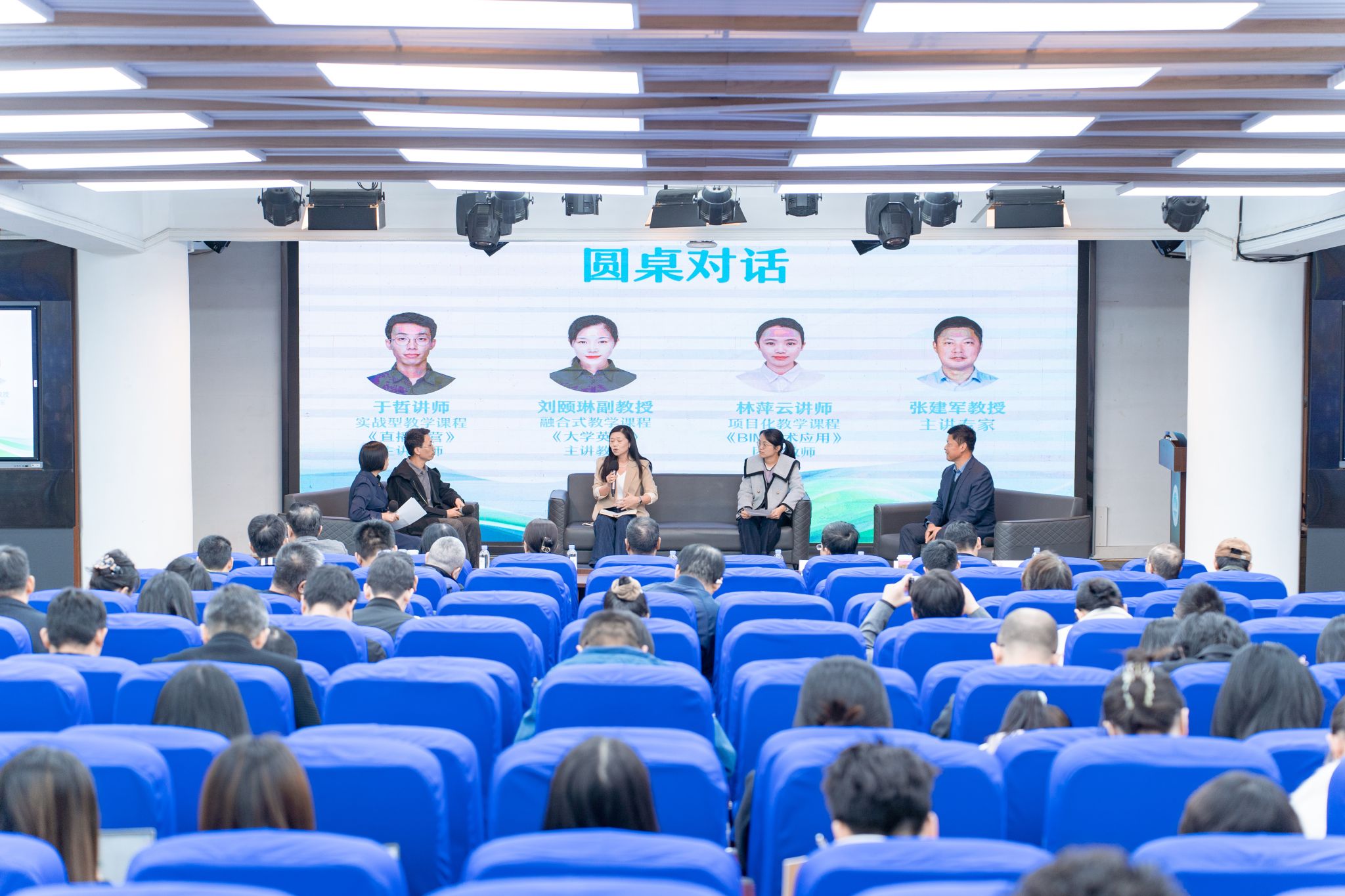 在随后的圆桌对话环节,3位一线教师结合各自课程分享了应用心得。刘颐琳副教授指出,“3C3S”教学法为《大学英语》实现通专融合提供了明确路径,并在与艺术专业的跨学科融合中成效显著;林萍云讲师认为,其“三段式”教学设计有效促进了《BIM技术应用》课程知识的系统整合,推动课堂形态向“以学生为中心、以问题为导向”转变;于哲讲师则表示,该教学法为《直播运营》等源于真实项目的课程提供了理论支撑与系统化构建方法。