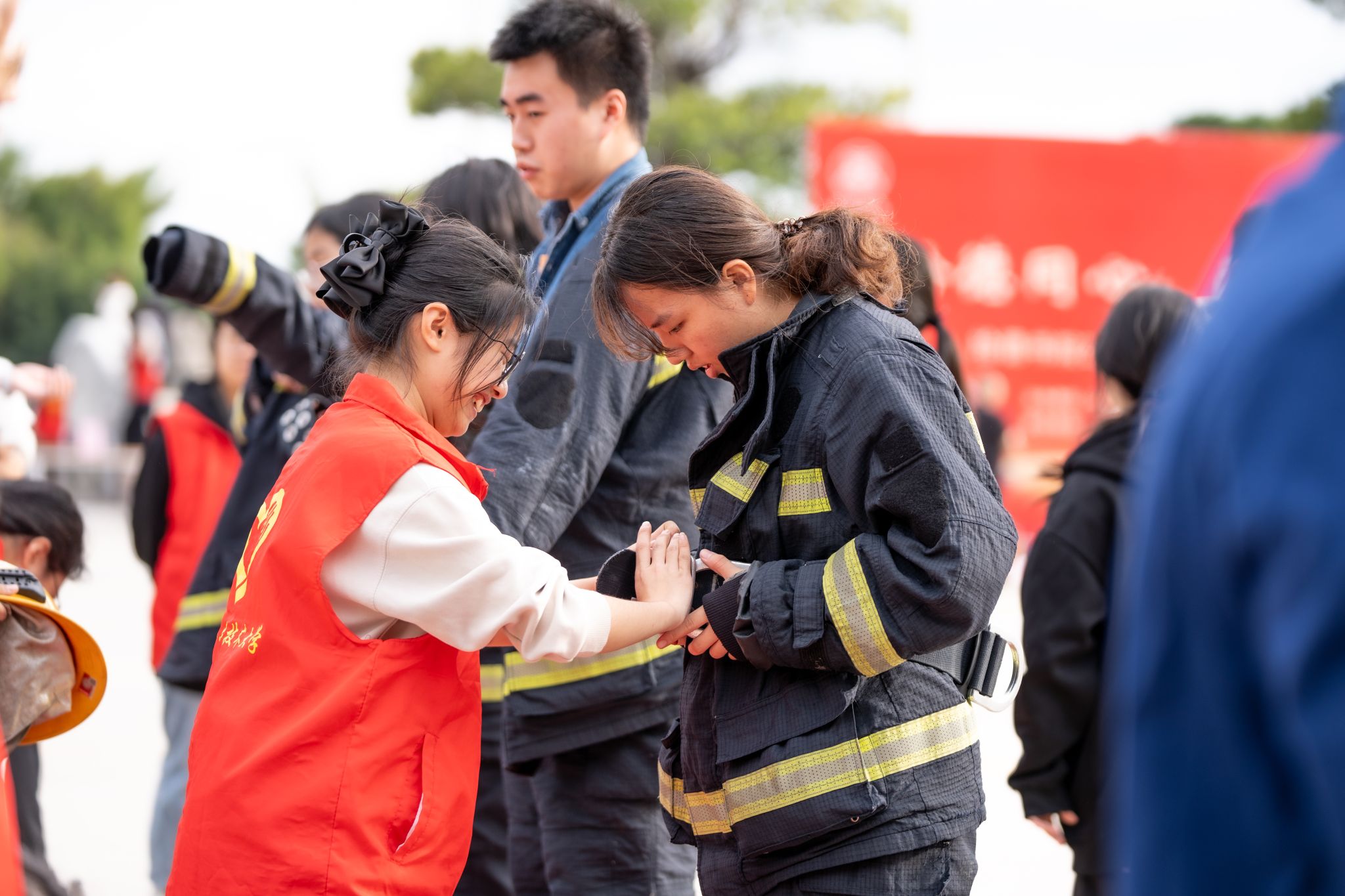 ▲ 同学们体验全套消防防护装备穿戴,并聆听专业人员讲解水枪装配和使用方式