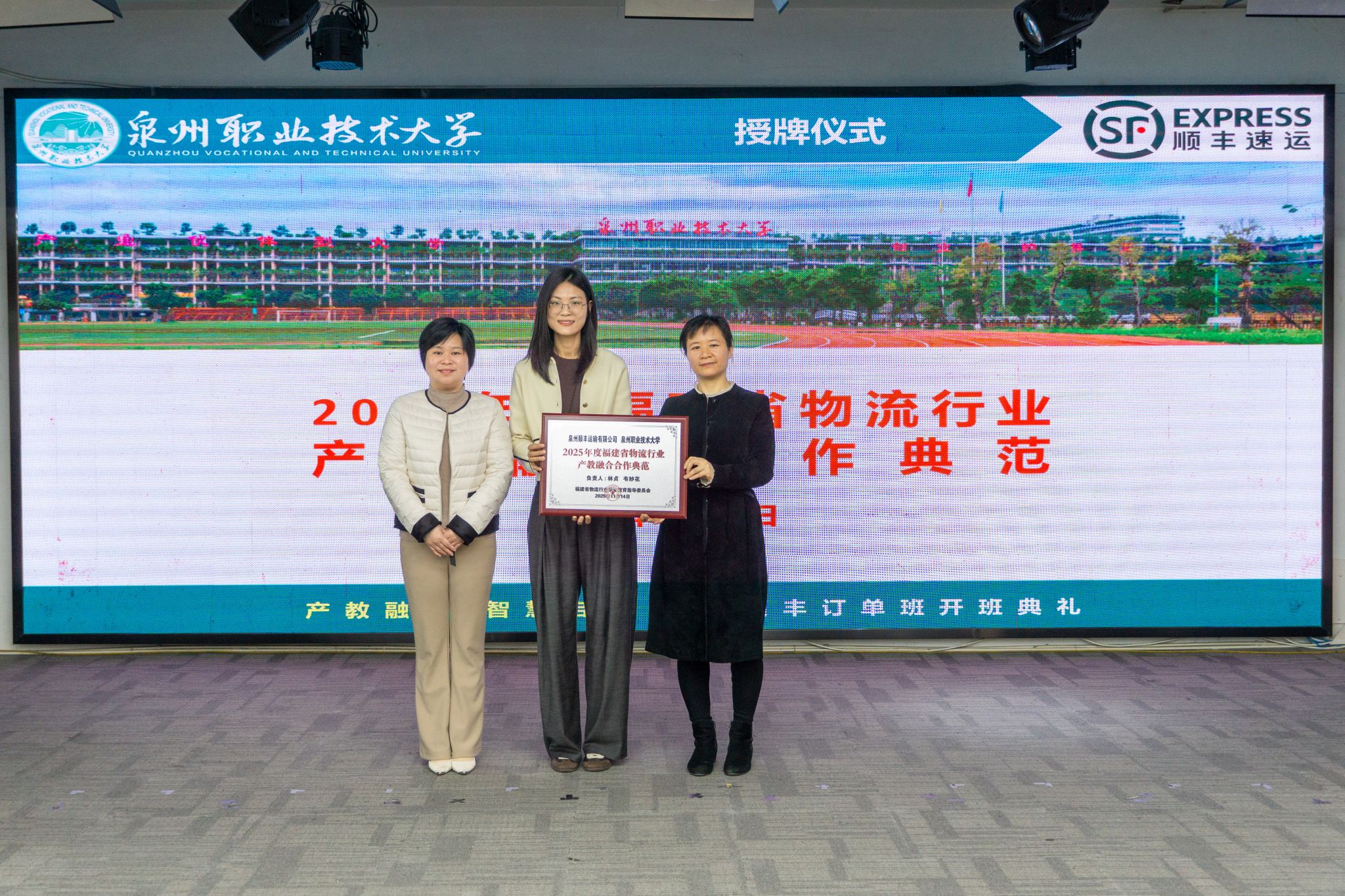 ▲ 校长助理、教务处处长苏康敏为校企双方合作负责人林贞、韦妙花颁发顺丰与泉大共同荣获的“2025年度福建省物流行业产教融合合作典范”的牌