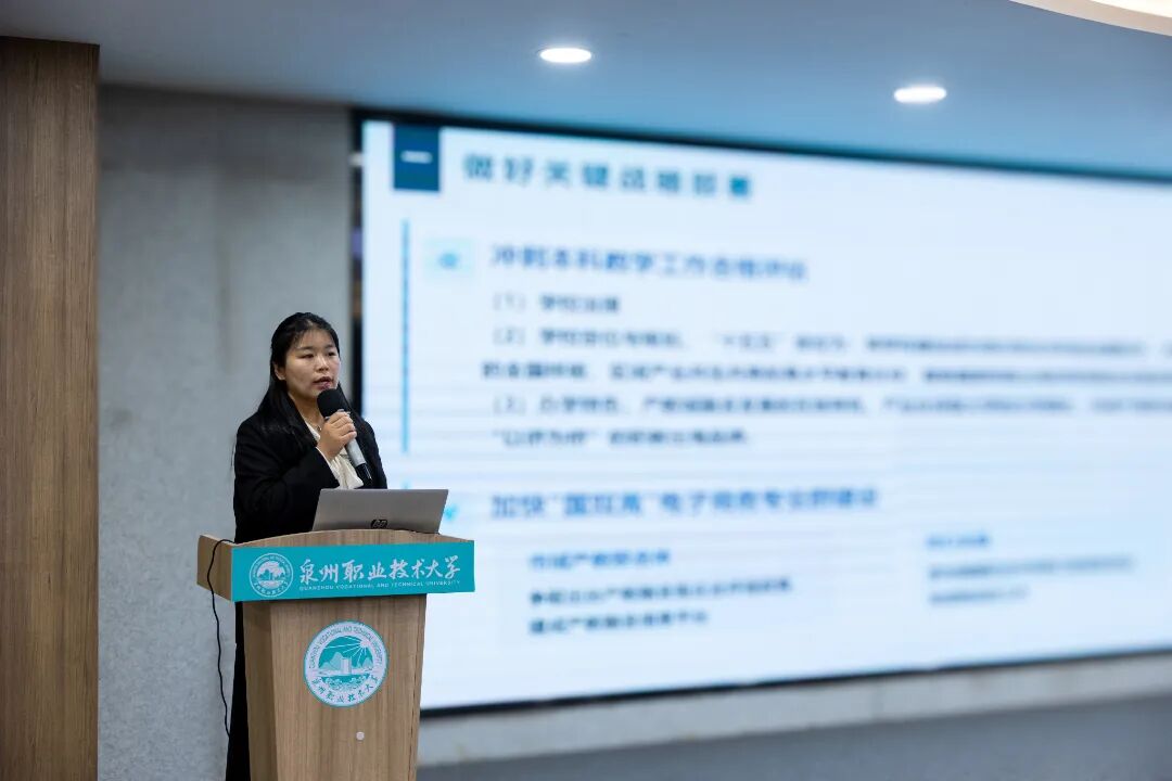 述职总结会上,吴滨如作《服务需求、深化产教城融合,提升关键办学能力》的主题报告,从“职业本科办学模式的思考”“产教城融合的探索与实践”“几点体会”三方面进行阐述,梳理学校扎根晋江、服务泉州、面向福建,主动对接服务区域产业发展和国家战略布局需求,围绕深化产教城融合,全速推进基于“产业伙伴型大学”和“市域产教联合体”双轮驱动的职业本科办学模式,推动学校高质量发展。她特别分享、解读了5个产教城融合的特色案例,分别是“以产定教”的省“双高”新一代信息技术专业群、“助产高端”的省“双高”智能装备制造专业群、“与产共荣”的国家“双高”电子商务专业群以及工艺美术专业群服务城市文旅产业、城市更新专业群服务未来城市建设,全面展示学校与城市、产业深度融合的实践探索及经验模式。