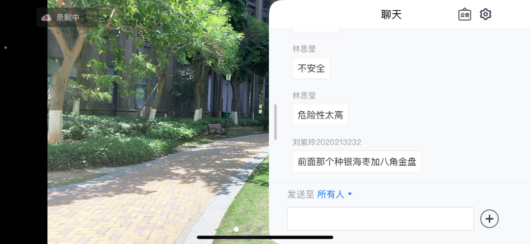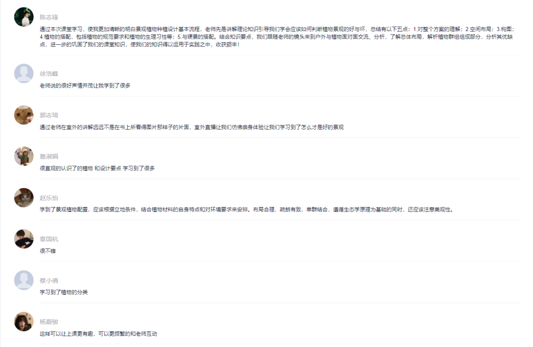 “开阔的阳光草坪可以营造出活力的开敞空间,密植的林荫小道可以营造出宁静的密闭空间,由植物半围合的木平台可以营造出休闲的半开敞空间。”陈老师拎着直播手机,边走边讲,同学们则在后台不断留言点评。