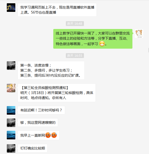 老师们互相交流,分享线上教学平台的使用感受,提出个人线上教学的经验与方法,给其他上课的老师提供参考。对使用线上教学平台不懂的地方,在群里互相帮助解决。