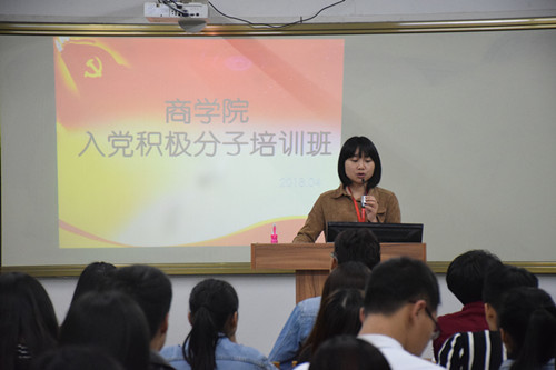 商学院党总支于2018年4月14日-2018年4月15日举办了入党积极分子培训班。出席本次培训班的老师有:商学院党总支书记陈荣惠老师,商学院党总支第一党支部书记游小玲老师,商学院党总支第二党支部书记罗永珍老师。参加此次培训班的入党积极分子共有85名,主要来自商学院16级、17级各专业的同学。