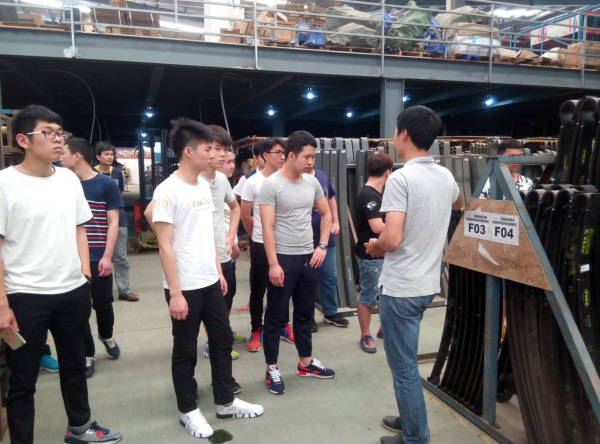 在仓储部的经理的带领下,同学们先后参观了公司的食堂、宿舍及娱乐设施场地等,并由仓储部的经理带领大家参观仓储部,同学们对摆放在货架上整齐、有序的汽车零配件所吸引,许多同学熟知各配件并能详细地说出配件作用,同学们对汽车的认识得到经理的认可。
