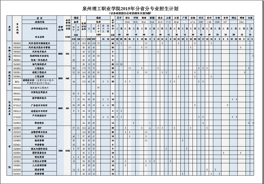 第八条  学费:车辆工程系、建筑设计系专业8500/学年;信息技术系专业8000/年;商学院专业7500/年。具体专业如下:车辆工程系:汽车检测与维修技术、汽车技术服务与营销、汽车运用技术、汽车电子技术、机械制造与自动化、机电一体化技术、油气储运技术;建筑设计系:工程造价、建筑工程技术、建筑设计类(含室内设计技术、环境艺术设计2个专业)、工程监理、建筑装饰工程技术;信息技术系:计算机应用技术、数字媒体技术、广告设计与制作、动漫设计与制作、产品造型设计、移动商务;商学院:会计、金融管理与实务、电子商务、市场营销、物流管理、国际贸易实务、报关与国际货运、商务英语、工商企业管理、人力资源管理、旅游管理、酒店管理。(泉州市物价局  泉价[2015] 48号)